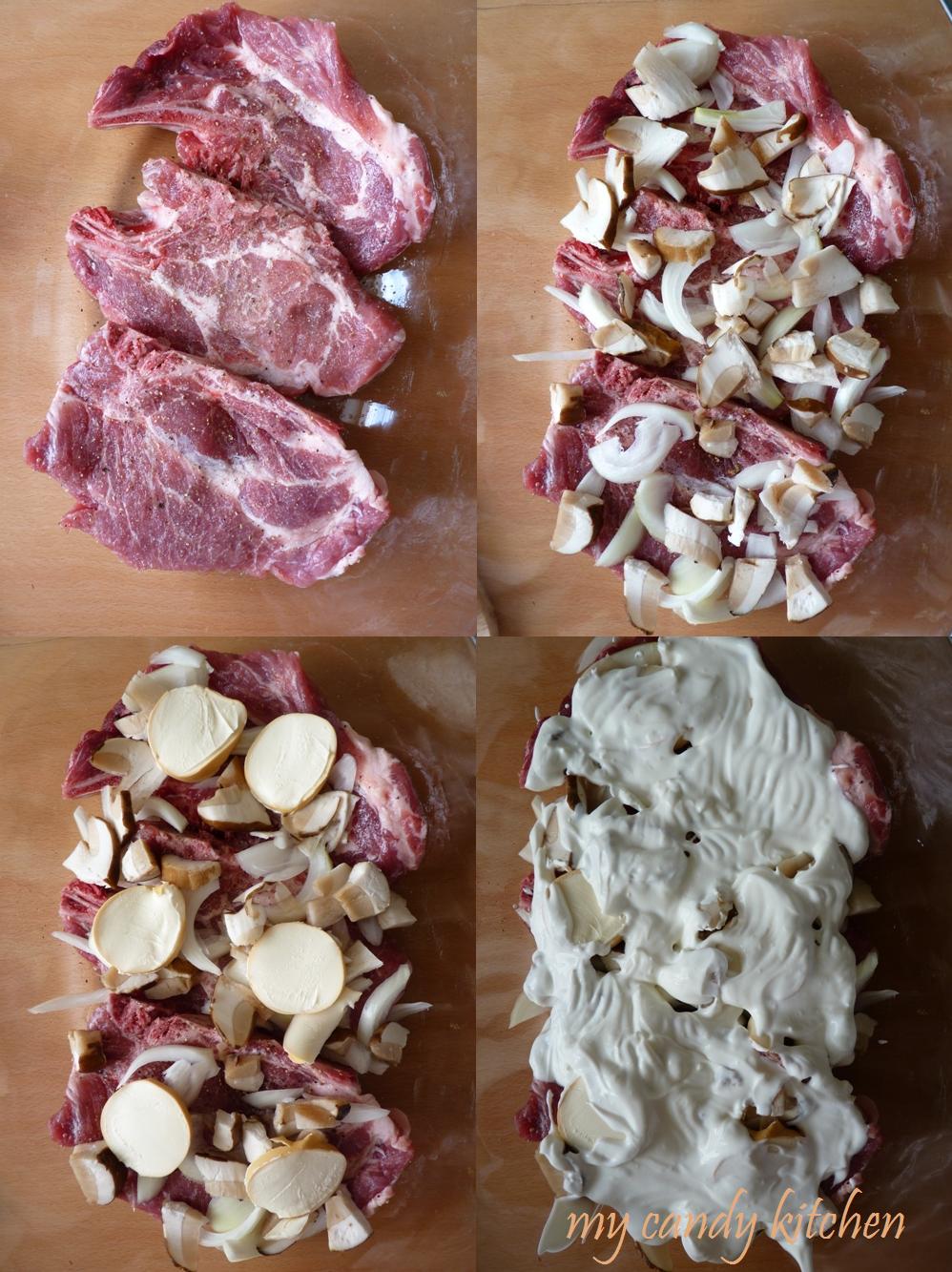 свински пържоли с гъби сметана и топено сирене на фурна